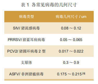 养殖业第一个空气过滤系统诞生在20世纪90年代的法国布列塔尼公猪站,此后,在2005-2010年间,美国有41个养殖场建设空气过滤系统。中国的养殖空气过滤系统发轫于2008年前后,同样也是首先应用于公猪站,均采用物理过滤法过滤相应粒径的病毒,各常见病毒的几何尺寸如表1所示。