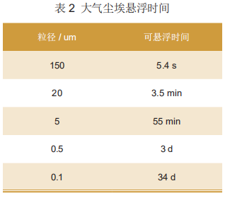 大气尘埃中,粒径小于1um的尘粒占总数量的99.9%,养殖畜禽易感病毒均依附于尘粒随气流传播,重量大的尘粒会沉降,重量轻的长时间浮游于空气中。大气尘埃悬浮时间如表2所示。