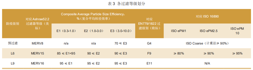 那么,到底该需要采用多大效率的过滤器,才可以将微粒病原浓度降低至致病浓度以下呢?基于明尼苏达猪病根除中心ScottDee博士的实验研究结论,通过对过去十年来国外、国内猪场过滤系统的调研统计结果亦证实:大部分猪场采用L6过滤器(根据样品实测为欧标的F9,美标为Merv15)作为主过滤器;在被认为高风险的猪场,采用了更高级别的L9过滤器(根据样品实测为欧标E11,美标为Merv16)为主过滤器;采用G4(Merv8)级别的初级过滤器作为主过滤器(Merv15/16)的保护过滤器(预过滤),来延长价格昂贵的主过滤器的使用寿命,可以有效保护猪舍免于遭受各种病毒的侵袭,各过滤等级划分如表3所示。