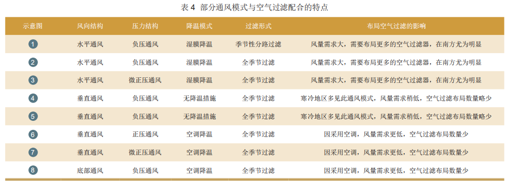 为了更直观表达部分通风模式与空气过滤配合的特点,见表4所示,各通风模式示意图如图1所示。
