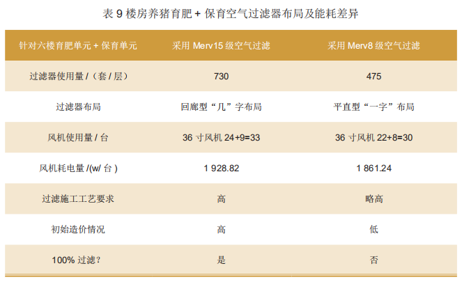 部分养殖企业在实际使用中,形成了具有各自偏好的猪舍结构和布局方式,通风模式也有区别,比如:金新农铁力公猪站采用负压垂直通风、上海祥欣种公猪育种中心采用水平负压通风、天兆武胜公猪站采用有的余氏通风模式。在空气过滤系统规划设计中可以根据各场舍的不同特点,充分考虑工况和能耗,来调整过滤方案,不同的空气过滤系统设计思路所带来的过滤效果和运用能耗、维护费用是完全不同的。以楼房养猪育肥+保育混合同层为例来看,如表9所示。