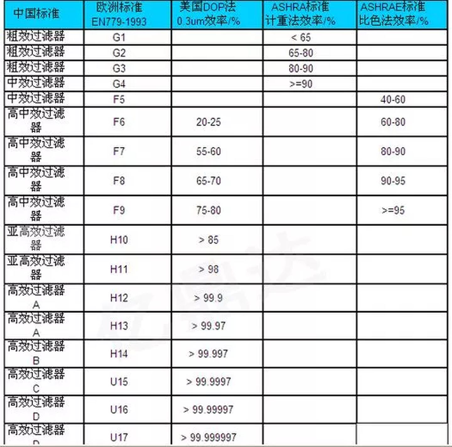 HEPA滤网等级划分(如上图):