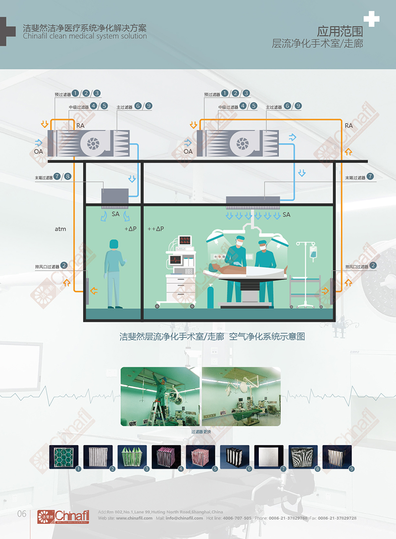 乐玩CHINAFIL“洁净医疗系统净化解决方案”在手术室净化中主要采用垂直层流式净化通风模式(Supply air ceiling for operating theatre),在空调/通风系统前端设置有多级空气预过滤(如图❶❷❸❹❺❻❾),并将无隔板高效过滤器设置在手术台正上方(❼),过滤后的洁净空气通过均流膜以均匀的流速向预设的方向输送,且保持微正压,持续确保手术台达到相应的洁净要求,排风系统的回风口通常设在墙面的四角。此外,在通往手术室的走廊也设置有相应级别的空气过滤器(❼❽),以保证手术室的洁净。